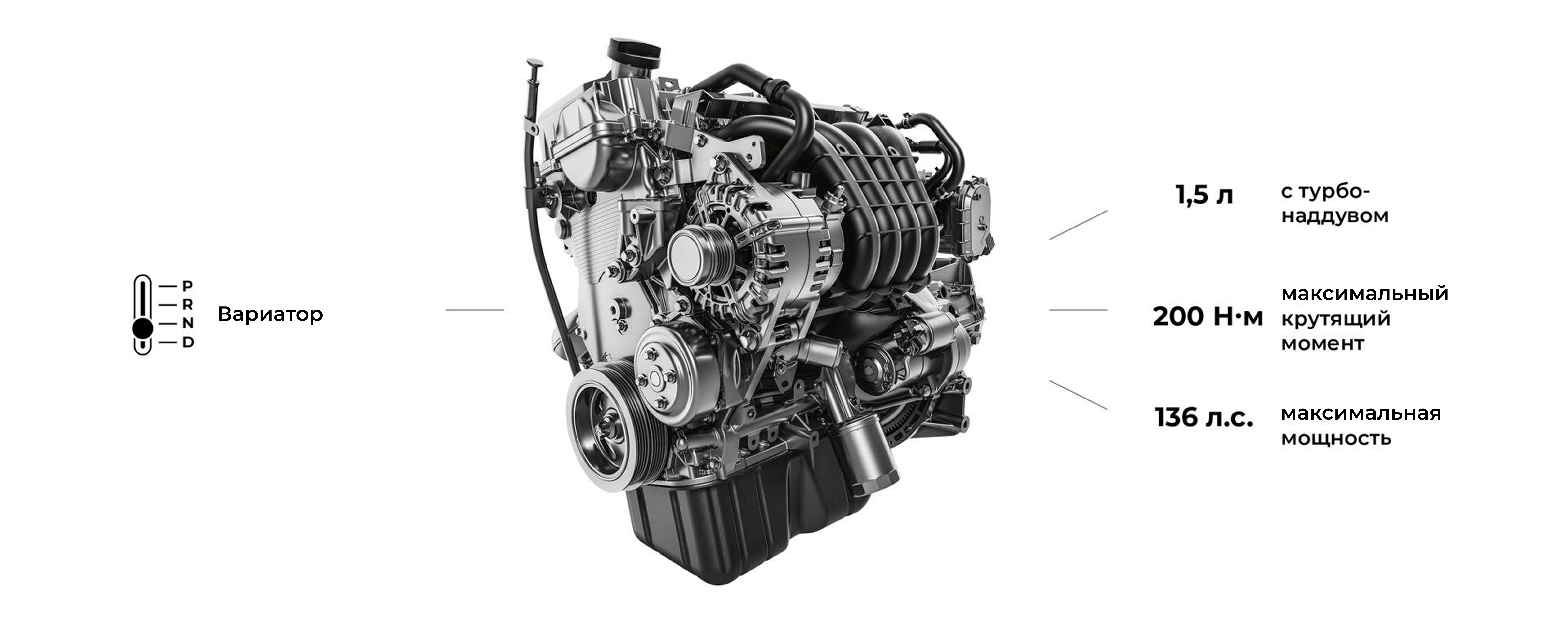Новый Москвич 3 оснащается бензиновым двигателем объемом 1,5 л с турбонаддувом мощностью 136 л.с. и крутящим моментом 200 Н·м в паре с автоматической трансмиссией Вариатор